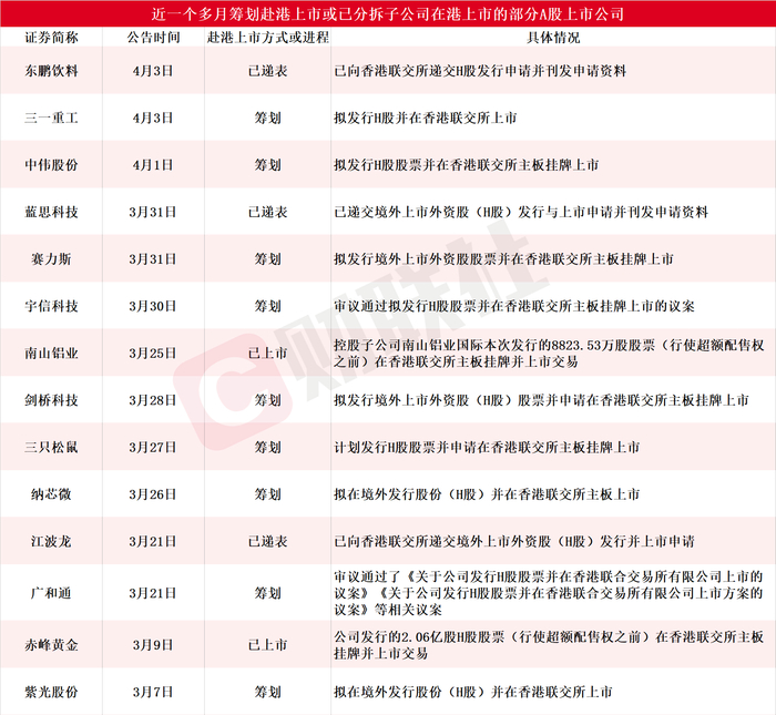 近期,A股多家上市公司宣布筹划H股上市事宜,“A+H”股持续扩容。据财联社不完全统计,截至发稿,3月迄今(3.1-4.4)包括东鹏饮料、三一重工、中伟股份、蓝思科技、赛力斯、宇信科技、南山铝业、剑桥科技、三只松鼠、纳芯微、江波龙、广和通、赤峰黄金和紫光股份在内的14家A股上市公司披露赴港上市进展情况或已分拆子公司在港上市,详细情况见下图: