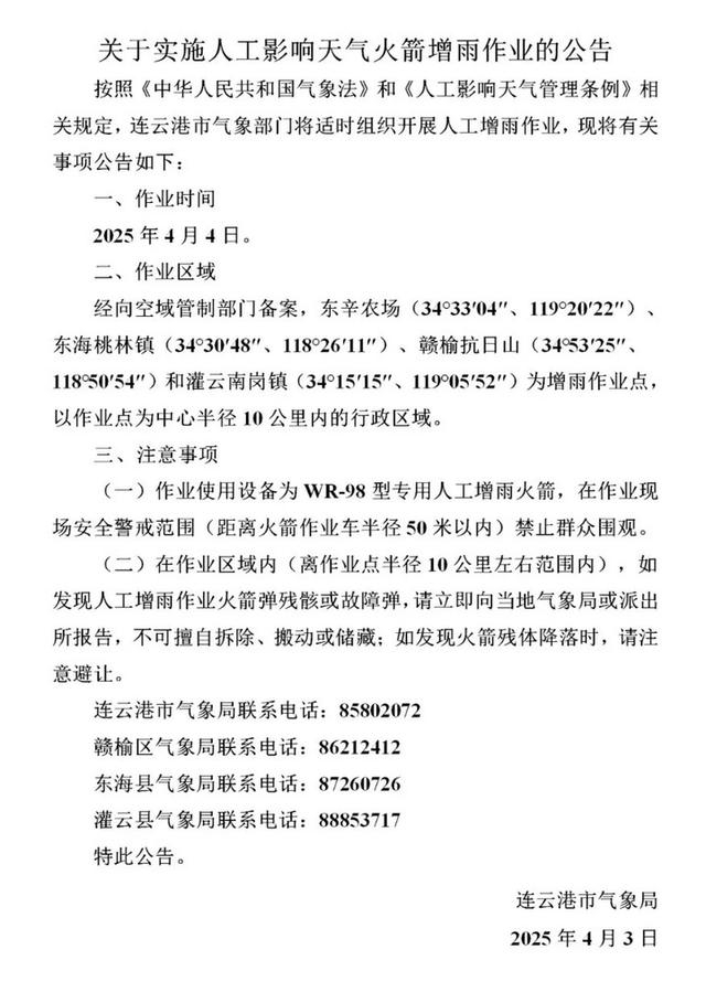 暂时没有雨水的区域,这两天也会迎来人工降水。4月3日,连云港市气象局发布《关于实施人工影响天气火箭增雨作业的公告》。公告显示,按照相关规定,连云港市气象部门将适时组织开展人工增雨作业,作业时间为2025年4月4日,东辛农场(34°933'04”、119°90'22")、东海桃林镇(34°30'48”、118°26'11")、赣榆抗日山(34°53'25"、118°50'54")和灌云南岗镇(34°15'15"、119°05'52")为增雨作业点,以作业点为中心半径10公里内的行政区域为作业区域,请该区域的民众注意安全。