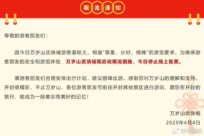 因今日万岁山武侠城游客量较大,根据“限量、分时、错峰”的游览要求,为确保游客朋友的安全和游览体验,万岁山武侠城现启动限流措施,今日停止线上售票。各位游客朋友可前往开封其他景区进行游玩。