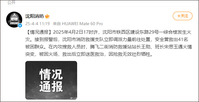 4月2日,沈阳市一综合楼发生火灾。消防救援站站长王勋、班长宋思玉被困火场,救出后送医,因抢救无效壮烈牺牲。