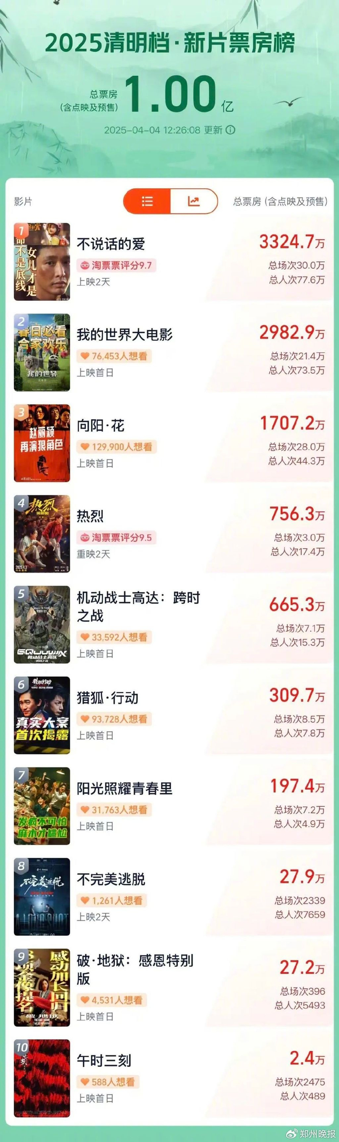 据网络平台数据,截至4月4日12时26分,2025年清明档新片(含重映)票房(含点映及预售)突破1亿,影片《不说话的爱》《我的世界大电影》《向阳·花》位列前三。