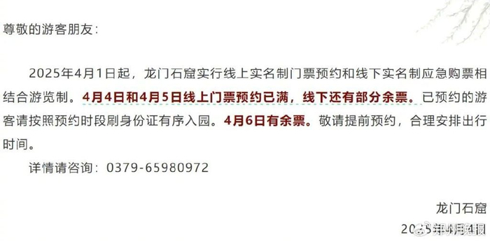 2025年4月1日起,龙门石窟实行线上实名制门票预约和线下实名制应急购票相结合游览制。4月4日和5日线上门票预约已满,线下还有部分余票。已预约的游客请按照预约时段刷身份证有序入园。4月6日有余票。