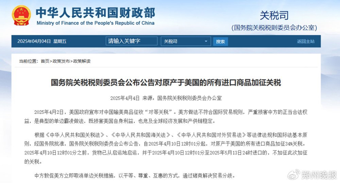 国务院关税税则委员会发布关于对原产于美国的进口商品加征关税的公告,自2025年4月10日12时01分起,对原产于美国的进口商品加征关税。