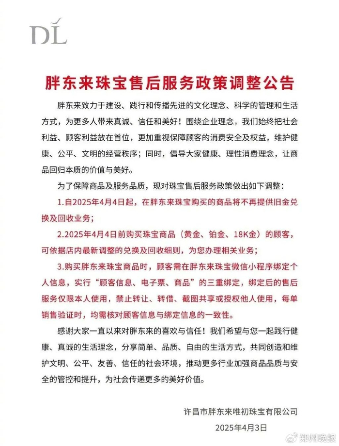 4月3日,胖东来唯初珠宝发布《胖东来珠宝售后服务政策调整公告》,自2025年4月4日起,在胖东来珠宝购买的商品将不再提供旧金兑换及回收业务。