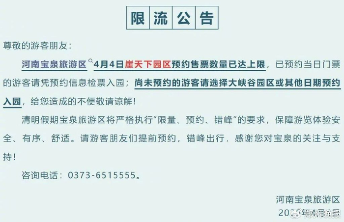 河南宝泉旅游区4月4日崖天下园区预约售票数量已达上限,已预约当日门票的游客请凭预约信息检票入园;尚未预约的游客请选择大峡谷园区或其他日期预约入园,请游客朋友们提前预约,错峰出行。