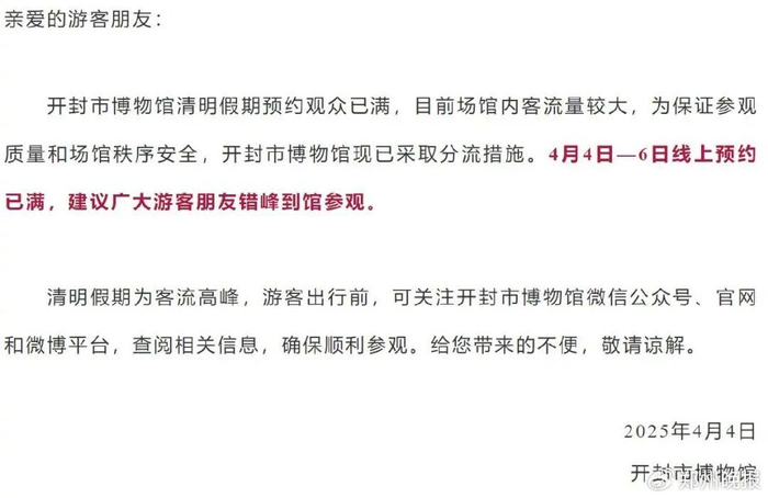 开封市博物馆清明假期预约观众已满,目前场馆内客流量较大,为保证参观质量和场馆秩序安全,开封市博物馆现已采取分流措施。4月4日~6日线上预约已满,建议广大游客朋友错峰到馆参观。