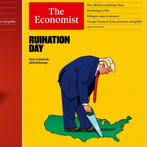 一版封面上,呈现的是特朗普手持手锯,正将美国版图生生切开的卡通画面,暗示其关税政策对美国乃至世界经济贸易的损害;