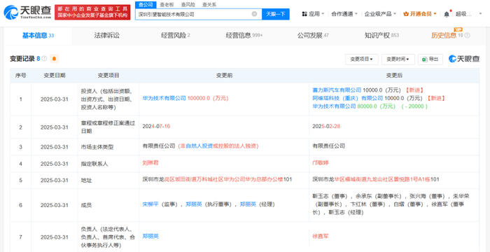 2025年3月31日,引望已完成工商信息变更,股东新增赛力斯汽车有限公司、阿维塔科技(重庆)有限公司。