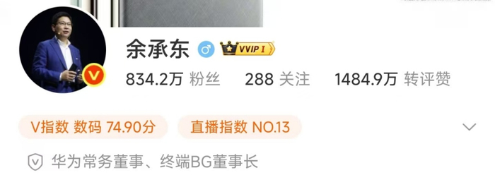 在微博、抖音等平台,余承东的身份认证信息也同步进行了调整,取消了智能汽车解决方案BU董事长的描述。