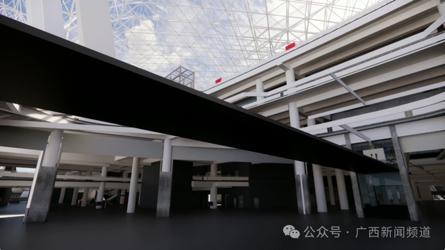 中建二局安装公司南宁吴圩机场T3航站楼二标段钢结构项目总工程师董立介绍:"空侧的观景平台方便旅客在候机的时候可以全景观赏到飞机的起飞和降落,陆侧的景观平台是在66米超大跨度网架下悬挂的双层景观平台。主要是一些餐饮和一些小型的商业综合体。"