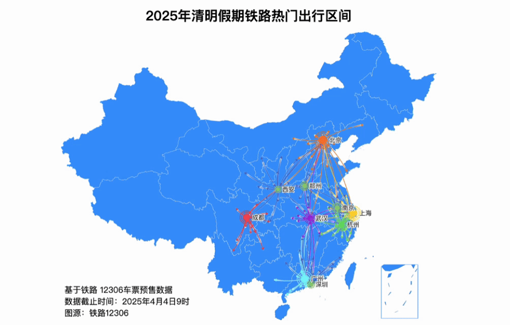 截至4月4日9时,铁路12306已累计发售清明假期车票5710万张。从车票预售情况看,今日热门出发城市主要有北京、广州、上海、成都、杭州、武汉、南京、郑州、深圳、西安;热门到达城市主要有北京、广州、上海、成都、杭州、武汉、深圳、南京、郑州、西安;深圳往返香港、武汉往返长沙、南宁往返广州、成都往返西安、北京往返沈阳、北京往返郑州、北京往返济南、北京至上海等热门区间客流相对集中。