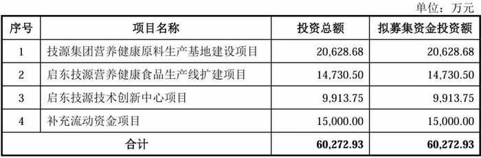 公司次IPO拟募集资金6.03亿元,主要用于技源集团营养健康原料生产基地建设项目、启东技源营养健康食品生产线扩建项目、启东技源技术创新中心项目以及补充流动资金项目。