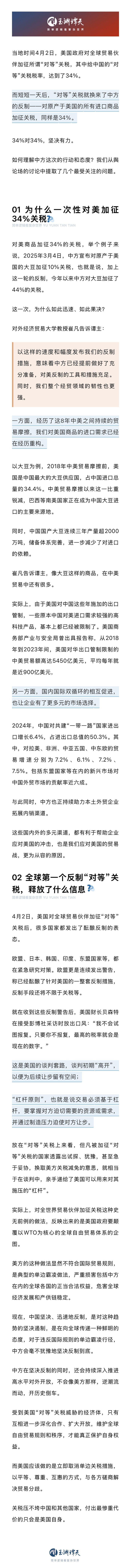 4月4日,中方11箭齐发,坚决反制美国加征的对等“关税”。其中,中方宣布,对原产于美国的所有进口商品加征34%关税。“34%”和“所有”都引发了舆论场的广泛讨论。谭主回答几个大家最关心的问题: