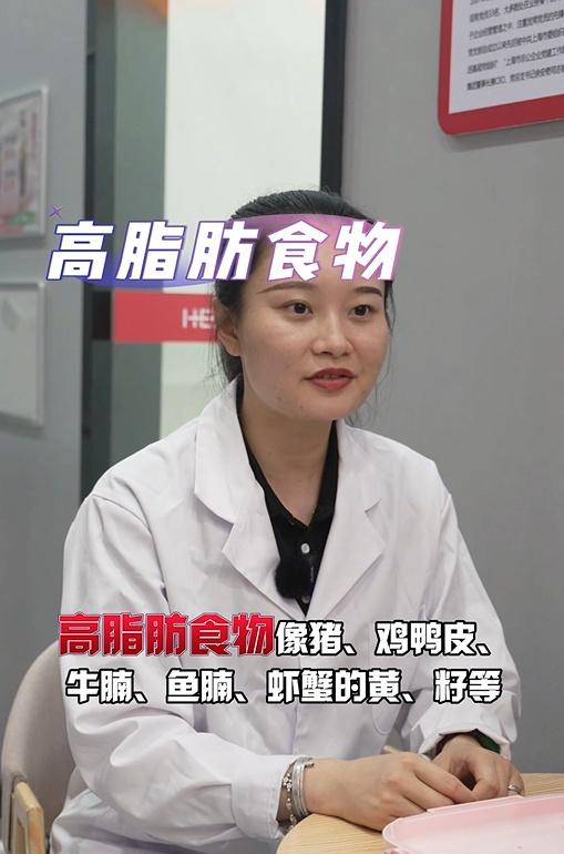 高脂肪食物:肥肉、鸡鸭皮、牛腩、鱼腩、虾蟹的黄、籽等