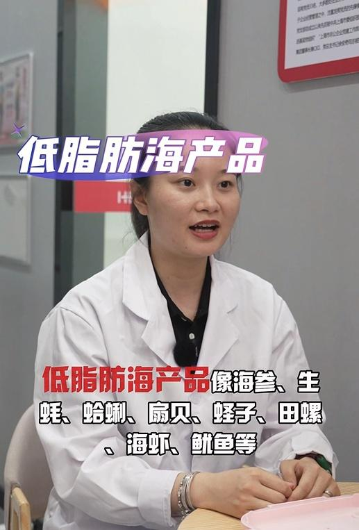 低脂肪海产品:海参、生蚝、蛤蜊、扇贝、蛏子、田螺、海虾、鱿鱼等