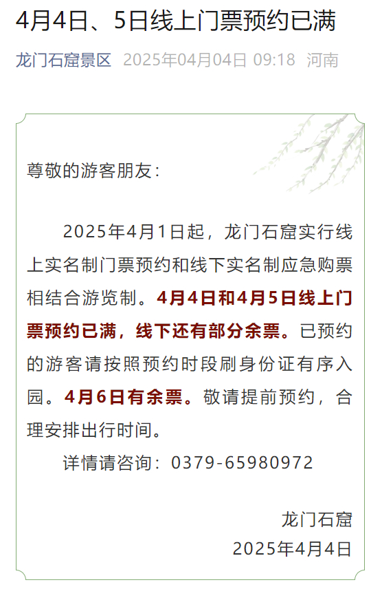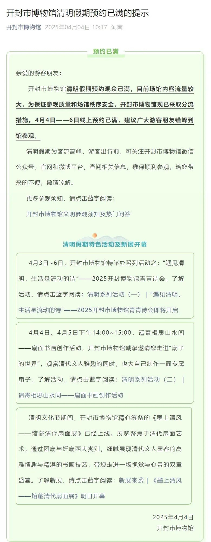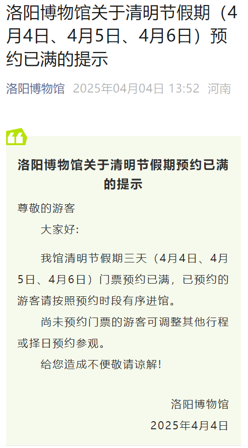 洛阳博物馆清明节假期(4月4日、4月5日、4月6日)预约已满