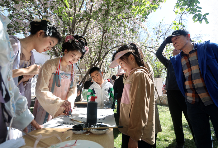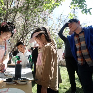 花自成蹊。赏海棠的人群摩肩接踵,铭德道、花堤路以及第九教学楼、法学院、王学仲艺术研究所等处的连片花树,依旧是经典打卡处。随处可见各种镜头,记录繁花世界里的人潮汹涌。丰富多彩的学院主题活动、学生社团风采展示,也吸引了各个年龄层的积极参与。铭德道上,13米“百卅长卷”千人拼图,一名5岁小朋友在爸爸的帮助下按下了一块色彩;来自新华中学的张同学,在北洋诗词社的飞花令擂台对句花诗;图书馆外的AI画海棠,直接描绘心中的天大海棠故事……