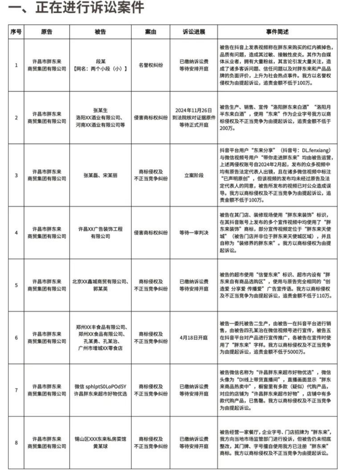 另外,胖东来还公布了其他7项正在进行诉讼的案件和9件拟起诉案件。