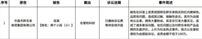 胖东来以名誉权侵权为由,对“红内裤”事件博主段某【网名:两个小段(小)】提起诉讼。