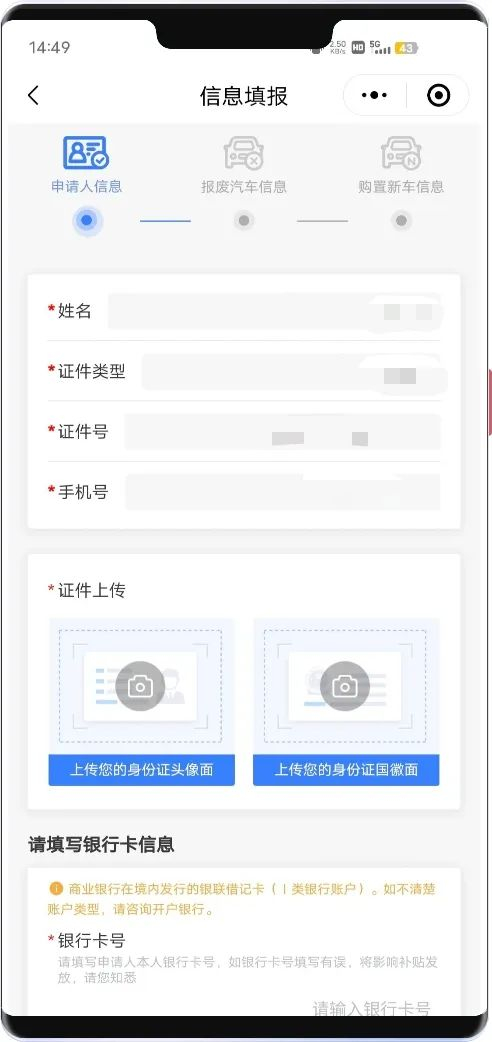 ③根据提示,填写申请人信息、报废汽车信息、购置新车信息,即可申请汽车以旧换新补贴。