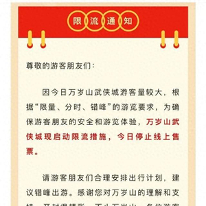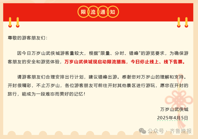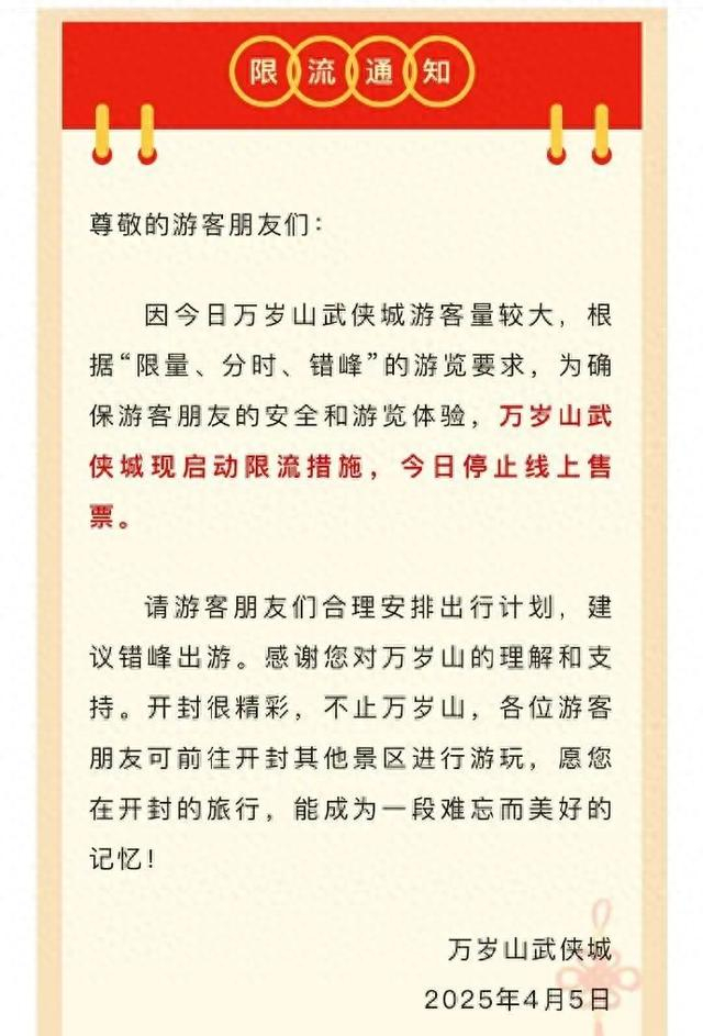 5日下午,景区再次发布通知:今日停止线上、线下售票。