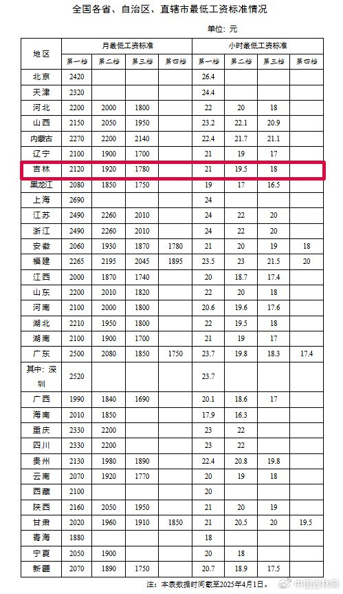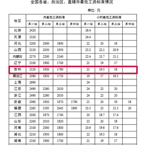★人力资源和社会保障部3日发布了全国各省、自治区、直辖市最低工资标准情况(截至2025年4月1日)。其中,吉林省第一档月最低工资标准为2120元,第一档小时最低工资标准为21元。第二档和第三档分别为1920元、1780元。