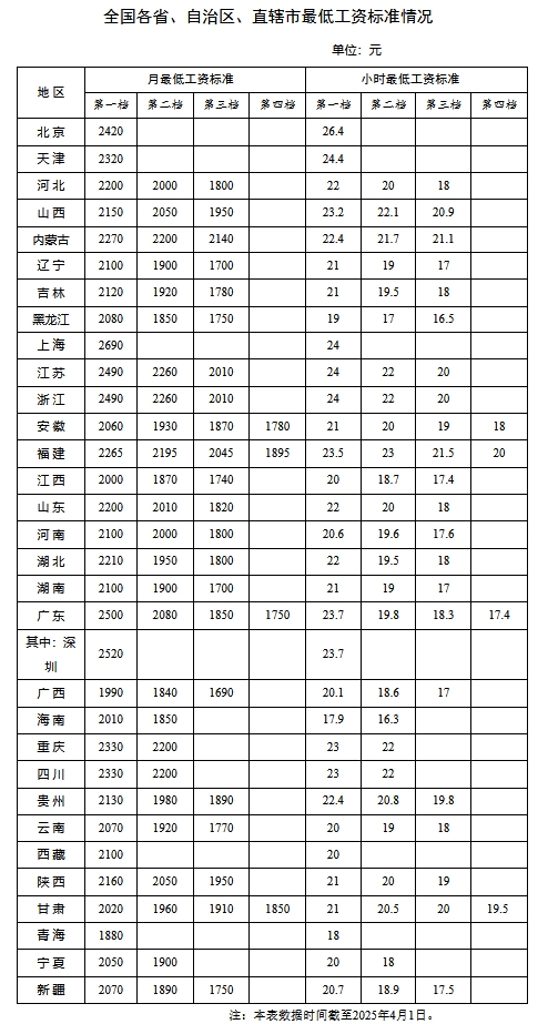今年以来,已有多个省份上调最低工资标准。其中,2025年3月1日起,广东调整提高该省全日制就业劳动者月最低工资标准和非全日制小时最低工资标准。此次调整仍保持四类标准,其中广州、深圳执行一类标准,广州市调整为2500元/月,深圳市调整为2520元/月,两市对应的非全日制小时最低工资标准均为23.7元/小时。