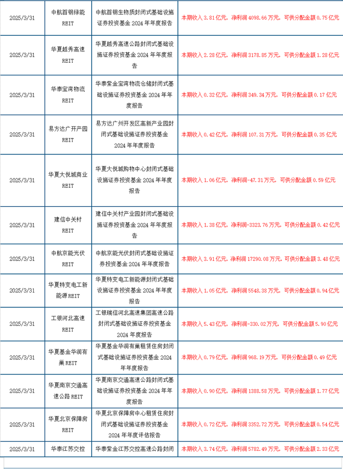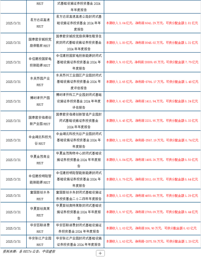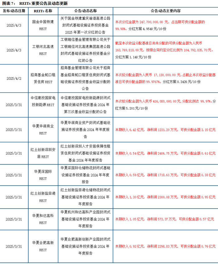 重要公告回顾:1)国金中国铁建REIT:分红金额为24770.0万元;2) 工银河北高速REIT:按照合同约定分红比例拟分配金额10479.3万元;3)招商基金蛇口租赁住房REIT:拟分配金额为人民币 1713.0万元;4)中信建投国家电投新能源REIT:本次拟分配金额为人民币41608.0万元;5)多家REITs发布年报数据:6)华夏华润商业REIT:本期收入6.4亿元,净利润1231.2万元,可供分配金额3.2亿元;7)红土创新深圳安居REIT:本期收入0.5亿元,净利润2406.8万元,可供分配金额0.6亿元;8)华夏深国际REIT:本期收入0.6亿元,净利润1718.6万元,可供分配金额0.4亿元;9)华夏和达高科REIT:本期收入1.1亿元,净利润573.4万元,可供分配金额0.6亿元;10)华夏合肥高新REIT:本期收入0.9亿元,净利润2298.8万元,可供分配金额0.8亿。