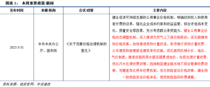 政策及新闻回顾:1)中共中央办公厅、国务院办公厅日前印发《关于完善价格治理机制的意见》,健全促进可持续发展的公用事业价格机制,明确政府投入和使用者付费的边界,强化企业成本约束和收益监管,综合评估成本变化、质量安全等因素,充分考虑群众承受能力,健全公用事业价格动态调整机制。
