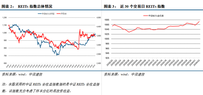 本周中证REITs全收益指数上涨0.63%,收于1078.09。从我们构建的指数来看,本周产权类REITs上涨1.8%,经营权类REITs上涨0.4%。4月3日,华夏华电清洁能源REIT获上交所问询,监管关注点主要集中于项目运营模式、资产重组与租赁安排、项目估值以及同业竞争四个方面,旨在确保项目的稳定运营和估值的合理性。此外,本周国泰君安东久新经济REIT扩募获受理,这也是市场上首个扩募购入标准厂房资产的公募REITs项目。