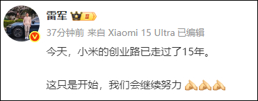 2025年4月6日是小米公司成立15周年,刚刚,小米创办人雷军发文称:“今天,小米的创业路已走过了15年。这只是开始,我们会继续努力。”