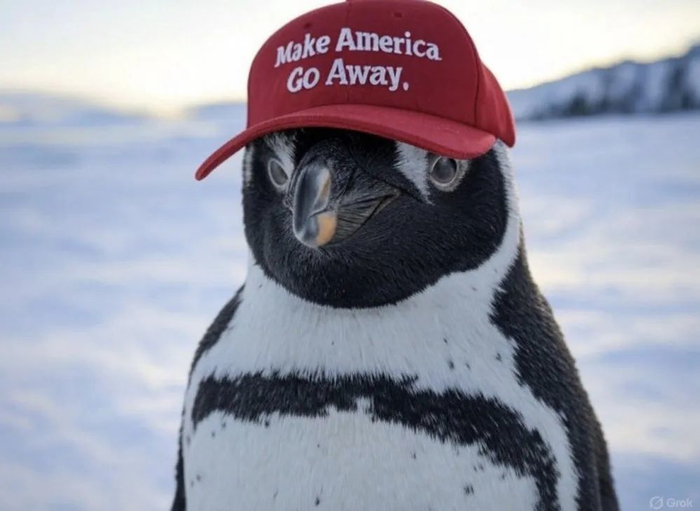 梗图背景:特朗普标志性红帽上写着“Make America Great Again”,缩写为“MAGA”,意思是“让美国再次伟大”。这只企鹅头戴的小红帽上面写着“Make America Go Away”,缩写同样为“MAGA”,意思却是“让美国走远点”。