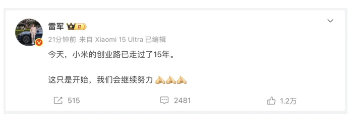 4月6日,小米公司创办人、董事长兼CEO雷军的微博在停更5日后更新:今天,小米的创业路已走过了15年。这只是开始,我们会继续努力。