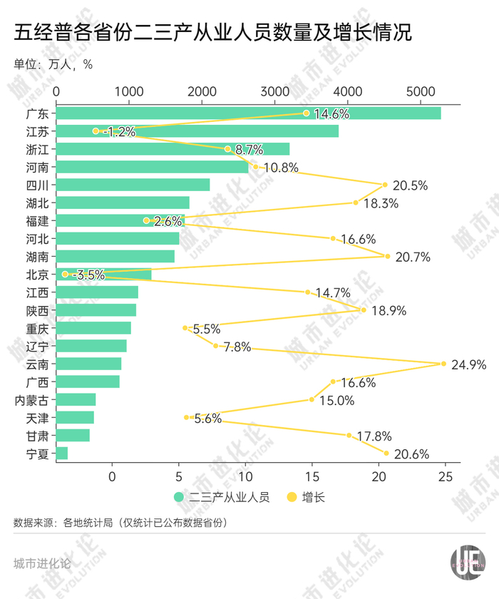 而如果把三产从业人员算上,绝大部分省份二三产从业人员总量都在增加,除了江苏和北京。