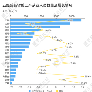 二产从业人员下降的省份中,江苏、浙江、天津、北京、重庆降幅在10%以上,福建的降幅在20%以上;上升的省份中,内蒙古、宁夏、陕西、云南等地涨幅较高。