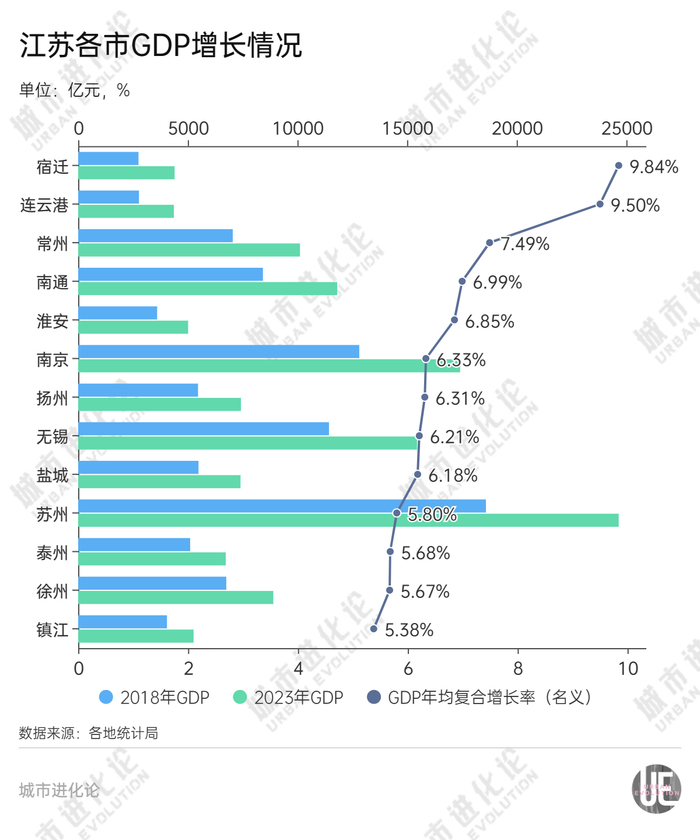 结果来看,建筑业下滑并未对南通经济造成太大影响。两次经济普查的5年间(2018年至2023年),南通GDP的年均复合增长率(名义)为6.99%,在江苏省内排名第四,高于南京、无锡、苏州等地。