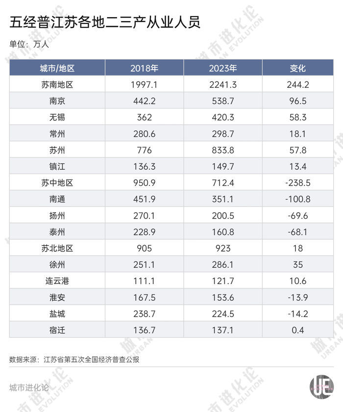 经济普查公报显示,苏南5地的二三产从业人员全部上涨,其中南京上涨最多将近100万人,苏州、无锡从业人员均上涨了50多万。苏北地区中,徐州、连云港的从业人员上涨,但淮安、盐城下降。