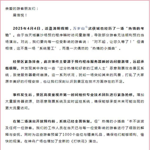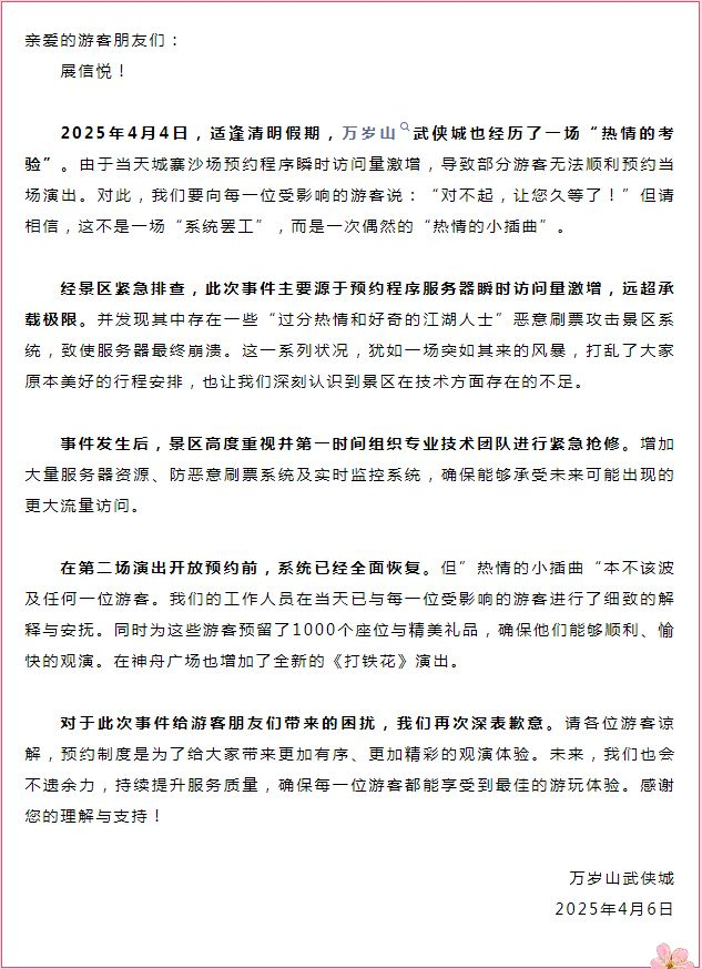 4月6日,万岁山武侠城发布《春日来信:为预约系统带来“小插曲”向您致歉》称,由于当天城寨沙场预约程序瞬时访问量激增,导致部分游客无法顺利预约当场演出。景区向每一位受影响的游客说:“对不起,让您久等了!”。