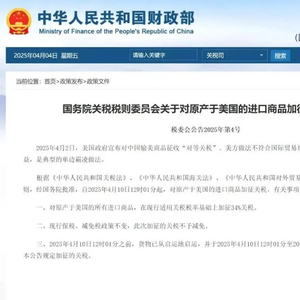 4月4日,中方出台系列反制举措,国务院关税税则委员会对外公布公告,明确自2025年4月10日12时01分起,对原产于美国的所有进口商品,在现行适用关税税率基础上加征34%关税。
