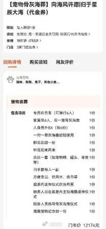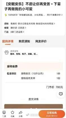 除了祭祀相关的产品,市面上还有宠物安乐、墓地等服务。《消费者报道》记者在大众点评网站看到,广州番禺某宠物殡葬店就提供宠物安乐、骨灰海葬、宠物墓地等服务、产品。此中,墓地费用最贵,在大众点评上的团购价为3989元,包括一方0.36平方米的墓地、入土仪式、大理石墓碑、墓地基础维护费(一年)等。