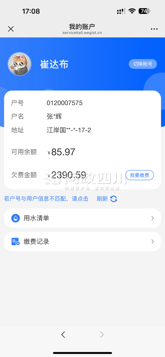 这位小区有业主此前投诉称,2024年10月15日,他收到江岸国际物业微信群消息,称其所在的小区9栋自来水表前期错乱问题,已由三台都宏水业有限公司调整完成,要求业主对欠费金额进行补缴。他通过“都宏水业”公众号查询,发现他家欠费2390.59元。