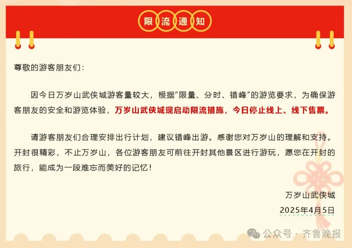 5日下午,景区再次发布通知:今日停止线上、线下售票。