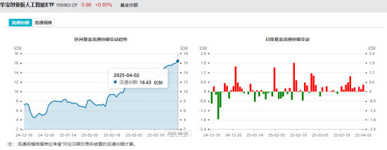 从单周表现看,受全球不确定性因素扰动,市场成长风格受压制,创业板人工智能指数单周下跌2.37%,周线三连阴。资金借道ETF频繁布局创业板人工智能,据统计,创业板人工智能ETF华宝(159363)近10日有9日获资金净流入,累计吸金达3.46亿元,最新基金份额达16.43亿份,再创上市新高。
