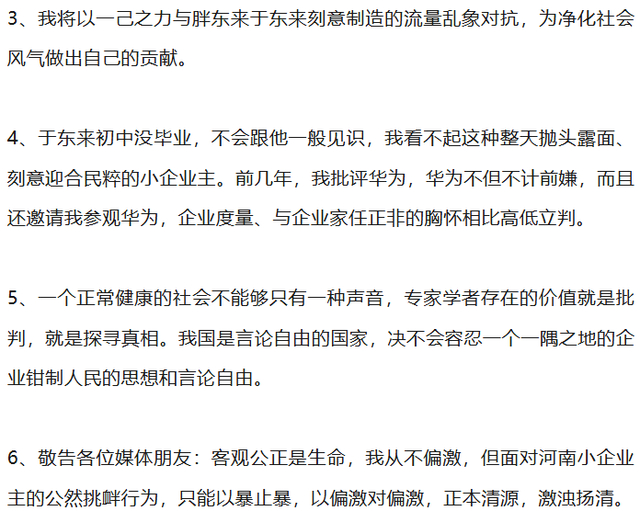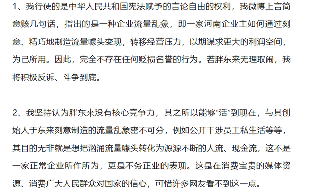 胖东来没有核心竞争力,也容不下哪怕一点儿质疑,动辄起诉这起诉那,这分明是无赖企业行径,更是河南企业界的耻辱。一家至今走不出河南一隅之地的小企业主,竟然能够有如此大的煽动民粹的力量,令人震惊。今天企业主于东来敢明目张胆地乱搞说真话的人,明天他可能就敢针对整个国家,我必须与这一小股“邪恶势力”殊死搏斗。
