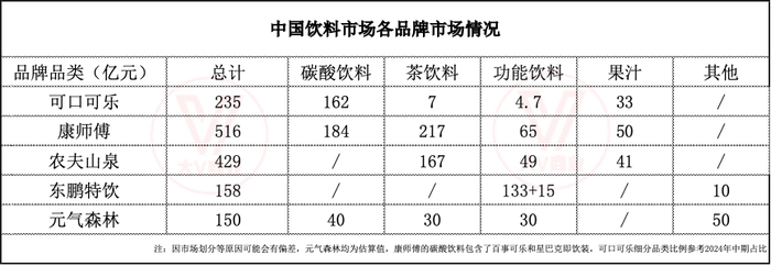 按照2024年的营收来看,可口可乐中国地区的销售额为235亿元人民币,康师傅总销售额516亿元,其中包括百事可乐和星巴克即饮茶,农夫山泉为429亿元,东鹏饮料158亿元,连成立时间最短的元气森林也在冲击150亿元。