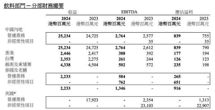 太古可口可乐销售的产品不止碳酸汽水,还有果汁类、茶饮类、能量饮料等产品。可口可乐整体销量不振的情况下,值得关注的是太古可口可乐2024年在中国内地的能量饮料收入实现了显著增长,同比大幅提升41%,咖啡业务的收入也实现了1%的同比增长。