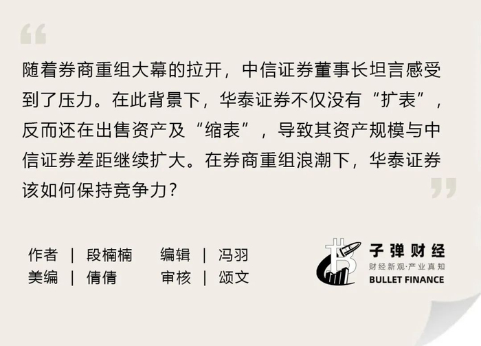 随着券商重组大幕的拉开,中信证券董事长坦言感受到了压力。在此背景下,华泰证券不仅没有“扩表”,反而还在出售资产及“缩表”,导致其资产规模与中信证券差距继续扩大。在券商重组浪潮下,华泰证券该如何保持竞争力,「界面新闻·子弹财经」将持续保持关注。