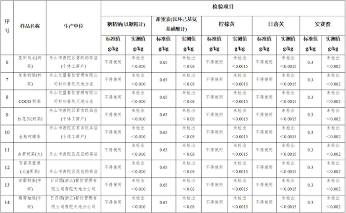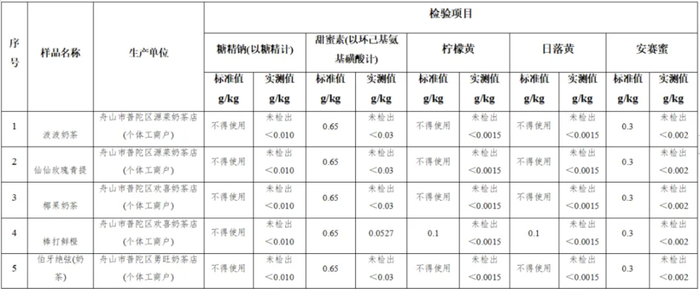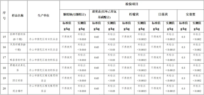 1、20批次的奶茶甜味剂均符合GB2760-2014《食品安全标准 食品添加剂使用标准》标准要求,其中糖精钠、安赛蜜指标检测结果均为未检出;1批次样品检出甜蜜素,检测结果为0.0527g/kg。
