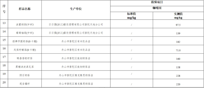 20批次的奶茶样品中19批次咖啡因均有不同程度的检出,检测结果在71.0-254mg/kg之间。