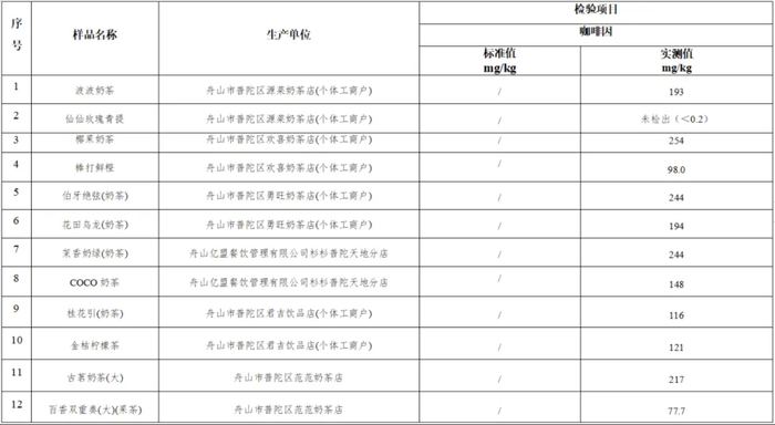 本次试验,围绕与食品质量安全密切相关的食品添加剂、理化指标对市场上销售的奶茶和纸杯各样品20批次进行检测,抽检结果整体比较好,国家强制性要求的项目都符合标准。20批次的奶茶样品中19批次咖啡因均有不同程度的检出,检测结果在71.0-254mg/kg之间;1批次样品检出甜蜜素,检测结果为0.0527g/kg,存在食品安全风险隐患。